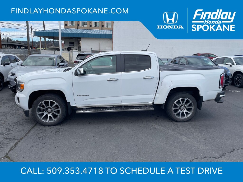 Friends, family, and neighbors have chosen us time and time again to be their dealer. Our simple and easy process, market aggressive pricing, and friendly knowledgeable staff are all reasons why. Come see for yourself why we are the top rated dealer in Spokane. Our process is designed to be easy, give you choices, and save you time. Our pressure free buying process allows you to see the quote you want. We give every customer multiple different monthly payments and down payments all on one sheet, so you can choose the one that best fits your budget. Come see how easy it is to purchase a car, truck, SUV from Findlay Honda Spokane. This GMC Canyon is equipped with these features: Driver Alert Package (Forward Collision Alert and Lane Departure Warning System), Preferred Equipment Group 4SD (5" Rectangular Chrome Assist Steps, Black Spray-On Bedliner w/GMC Logo, Denali-Specific Chrome Grille, Heated Steering Wheel, Polished Exhaust Tip, Tow/Haul Mode, Trailering Assist Guideline Hitch Guidance, Ultrasonic Rear Parking Assist, Ventilated Driver Seat, and Ventilated Front Passenger Seat), Trailering Package, 2 USB Data Ports, 3.42 Rear Axle Ratio, 4-Way Power Front Passenger Seat Adjuster, 4-Wheel Disc Brakes, 7 Speakers, ABS brakes, Air Conditioning, Alloy wheels, AM/FM radio: SiriusXM, Apple CarPlay/Android Auto, Auto-dimming Rear-View mirror, Automatic temperature control, Bose Premium 7-Speaker Audio System Feature, Bumpers: body-color, Compass, Delay-off headlights, Driver 6-Way Power Seat Adjuster, Driver door bin, Driver vanity mirror, Dual front impact airbags, Dual front side impact airbags, Electronic Stability Control, Exterior Parking Camera Rear, Front anti-roll bar, Front Bucket Seats, Front Center Armrest, Front fog lights, Front License Plate Kit, Front reading lights, Front wheel independent suspension, Fully automatic headlights, HD Radio, Heated door mirrors, Heated Driver & Front Passenger Seats, Heated front seats, Heated steering wheel, Illuminated entry, Integrated Trailer Brake Controller, Low tire pressure warning, Navigation System, Occupant sensing airbag, Outside temperature display, Overhead airbag, Overhead console, Panic alarm, Passenger door bin, Passenger vanity mirror, Perforated Leather-Appointed Seat Trim, Power door mirrors, Power Driver Lumbar Control Seat Adjuster, Power driver seat, Power Passenger Lumbar Control Seat Adjuster, Power passenger seat, Power steering, Power windows, Premium audio system: GMC Infotainment System, Radio data system, Radio: AM/FM w/8" Diagonal Color Touch-Screen Nav, Rear reading lights, Rear seat center armrest, Rear step bumper, Rear window defroster, Remote keyless entry, Security system, SiriusXM Radio, Speed control, Speed-sensing steering, Steering wheel mounted audio controls, Tachometer, Telescoping steering wheel, Tilt steering wheel, Traction control, Trip computer, Variably intermittent wipers, Ventilated front seats, and Wheels: 20" x 8.5" Diamond Cut Machined Aluminum.