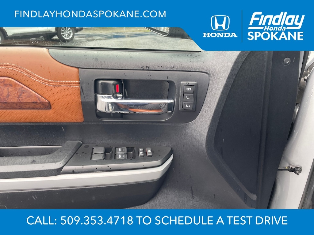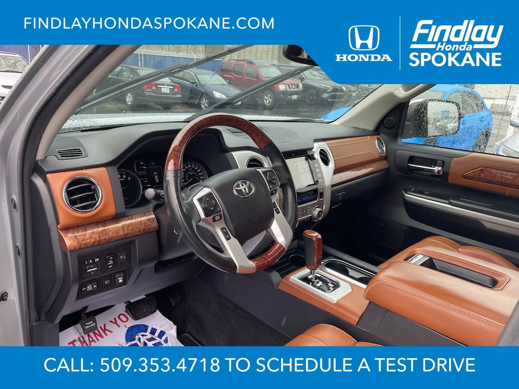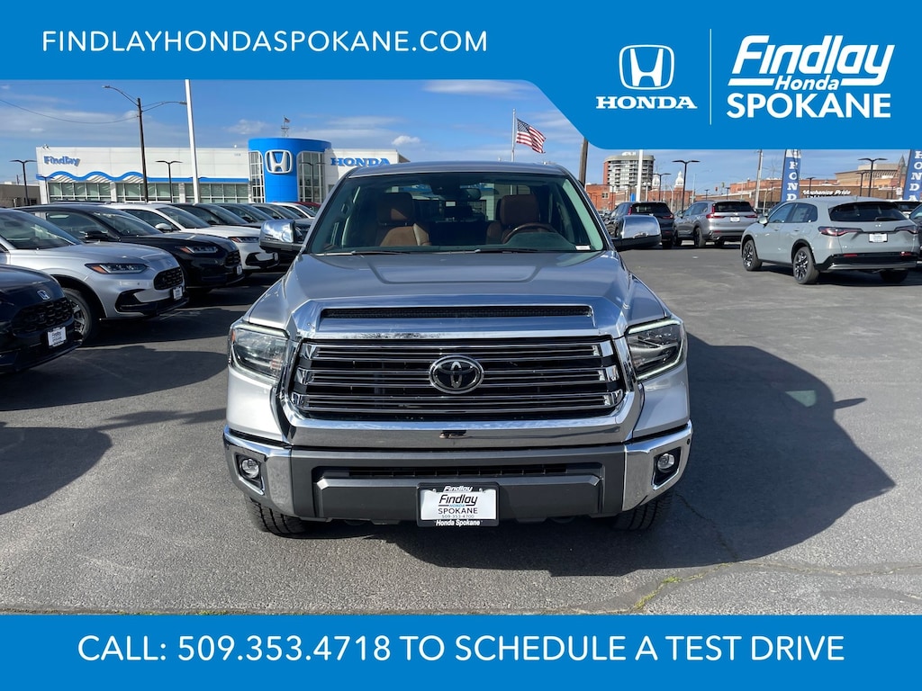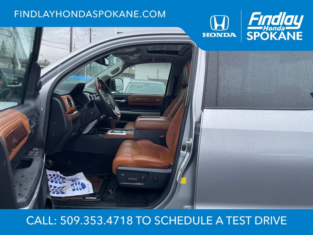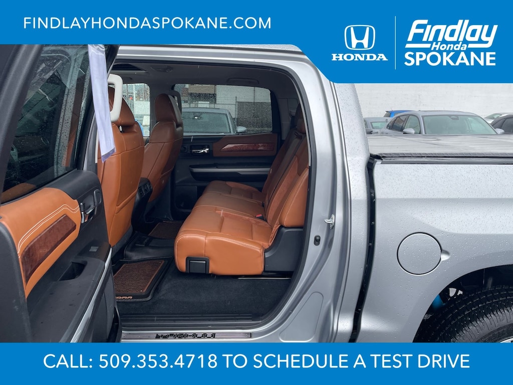 Friends, family, and neighbors have chosen us time and time again to be their dealer. Our simple and easy process, market aggressive pricing, and friendly knowledgeable staff are all reasons why. Come see for yourself why we are the top rated dealer in Spokane. Our process is designed to be easy, give you choices, and save you time. Our pressure free buying process allows you to see the quote you want. We give every customer multiple different monthly payments and down payments all on one sheet, so you can choose the one that best fits your budget. Come see how easy it is to purchase a car, truck, SUV from Findlay Honda Spokane. This Toyota Tundra is equipped with these features: 1794 Grade Package, TRD Off-Road Package (Bedside TRD Off Road Decal, LED Fog Lights, LED Headlights w/Black Sport Trim, Trail-Tuned Bilstein Shock Absorbers, and Wheels: 18" Split 5-Spoke TRD Off Road Alloy), Western Grade Package, 12 Speakers, 4-Wheel Disc Brakes, 4.30 Axle Ratio, ABS brakes, Air Conditioning, Alloy wheels, AM/FM radio: SiriusXM, Apple CarPlay/Android Auto, Auto High-beam Headlights, Auto-dimming door mirrors, Auto-dimming Rear-View mirror, Automatic temperature control, Brake assist, Compass, Delay-off headlights, Driver door bin, Driver vanity mirror, Dual front impact airbags, Dual front side impact airbags, Electronic Stability Control, Emergency communication system: Safety Connect with 1-year trial, Exterior Parking Camera Rear, Front anti-roll bar, Front Bucket Seats, Front Center Armrest, Front dual zone A/C, Front fog lights, Front reading lights, Front wheel independent suspension, Fully automatic headlights, Garage door transmitter: HomeLink, Heated & Ventilated Front Bucket Seats, Heated door mirrors, Heated front seats, Illuminated entry, Knee airbag, Leather Seat Trim (LD), Leather steering wheel, Low tire pressure warning, Memory seat, Navigation system: Dynamic Navigation (3-year trial), Occupant sensing airbag, Outside temperature display, Overhead airbag, Overhead console, Panic alarm, Passenger door bin, Passenger vanity mirror, Power door mirrors, Power driver seat, Power passenger seat, Power steering, Power Tilt & Slide Moonroof w/Sliding Sunshade, Power windows, Preferred Owners Portfolio (TMS), Radio data system, Radio: Premium JBL Audio w/Dynamic Navigation, Rear reading lights, Rear seat center armrest, Rear step bumper, Rear window defroster, Remote Connect, Remote keyless entry, Safety Connect, Security system, Service Connect, SiriusXM Radio, Speed control, Speed-sensing steering, Split folding rear seat, Steering wheel memory, Steering wheel mounted audio controls, Tachometer, Telescoping steering wheel, Tilt steering wheel, Traction control, Trip computer, Turn signal indicator mirrors, Variably intermittent wipers, Ventilated front seats, Voltmeter, and Wheels: 20" 6-Spoke Alloy w/Accented Spokes.