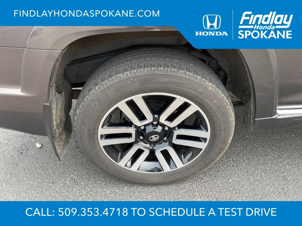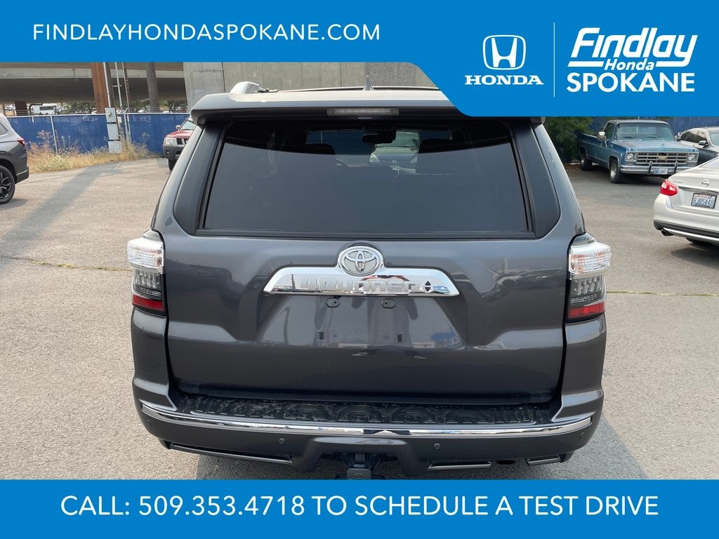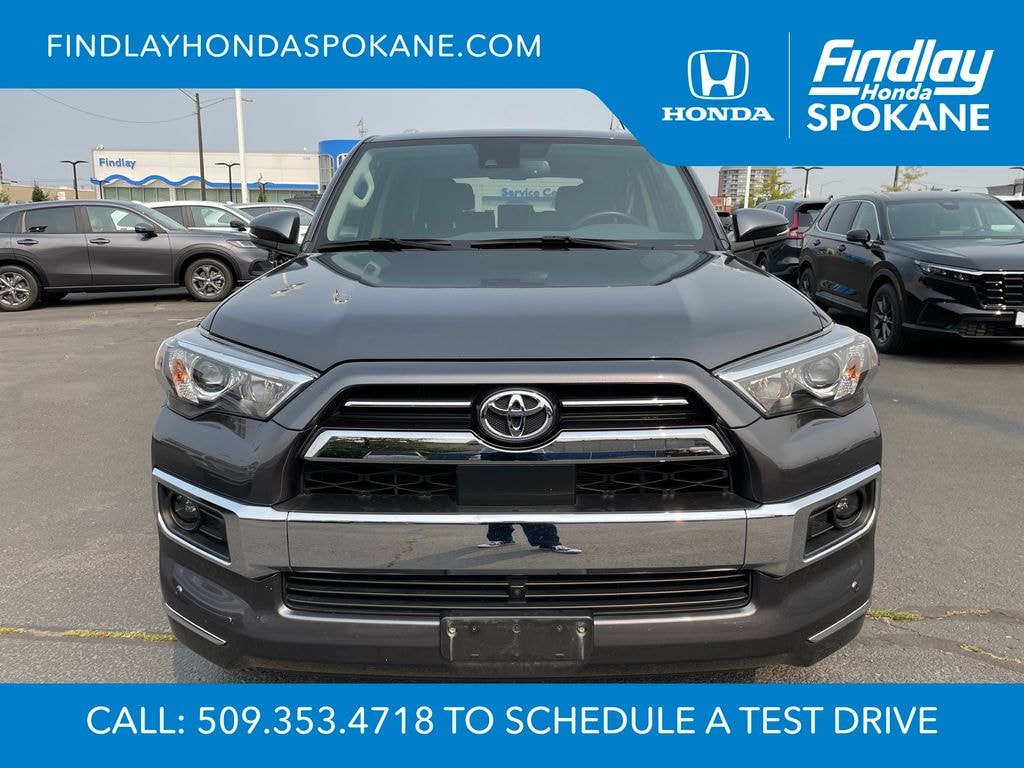 Friends, family, and neighbors have chosen us time and time again to be their dealer. Our simple and easy process, market aggressive pricing, and friendly knowledgeable staff are all reasons why. Come see for yourself why we are the top rated dealer in Spokane. Our process is designed to be easy, give you choices, and save you time. Our pressure free buying process allows you to see the quote you want. We give every customer multiple different monthly payments and down payments all on one sheet, so you can choose the one that best fits your budget. Come see how easy it is to purchase a car, truck, SUV from Findlay Honda Spokane. This Toyota 4Runner is equipped with these features: Limited Package (Dual Zone Auto Climate Control, Garage Door Opener, Heated Outside Rear-View Mirrors, Moonroof w/Tilt Up & Slide, Panoramic Back Monitor, and Silver Roof Rails), 15 Speakers, 3.727 Axle Ratio, 4-Wheel Disc Brakes, ABS brakes, Air Conditioning, Alloy wheels, AM/FM radio: SiriusXM, Anti-whiplash front head restraints, Apple CarPlay/Android Auto, Auto High-beam Headlights, Auto-dimming Rear-View mirror, Automatic temperature control, Brake assist, Bumpers: body-color, Compass, Delay-off headlights, Driver door bin, Driver vanity mirror, Dual front impact airbags, Dual front side impact airbags, Electronic Stability Control, Emergency communication system: Safety Connect (1-year trial), Front anti-roll bar, Front Bucket Seats, Front Center Armrest, Front dual zone A/C, Front fog lights, Front reading lights, Front wheel independent suspension, Fully automatic headlights, Garage door transmitter: HomeLink, Heated & Ventilated Front Bucket Seats, Heated door mirrors, Heated front seats, Illuminated entry, Knee airbag, Leather Seat Trim, Low tire pressure warning, Memory seat, Navigation System, Occupant sensing airbag, Outside temperature display, Overhead airbag, Overhead console, Panic alarm, Passenger door bin, Passenger vanity mirror, Power door mirrors, Power driver seat, Power moonroof, Power passenger seat, Power steering, Power windows, Radio: Premium Audio w/JBL, Rear anti-roll bar, Rear seat center armrest, Rear window defroster, Rear window wiper, Remote keyless entry, Security system, Speed control, Speed-sensing steering, Split folding rear seat, Spoiler, Steering wheel mounted audio controls, Tachometer, Telescoping steering wheel, Tilt steering wheel, Traction control, Trip computer, Turn signal indicator mirrors, Variably intermittent wipers, Ventilated front seats, and Wheels: 20" Unique Dual 6-Spoke Alloy.